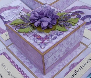 Środek exploding boxa zajmuje kolejne pudełko, zwykłe z pokrywką, na biżuteryjny prezent. Baza boxa ze sklepu Rzeczy z papieru, papiery - GP, dwa kwiaty na wieczku i liście - papier czerpany Namaste oraz wykrojniki m.in. APScraft (liście czereśni, baner M i baner L).