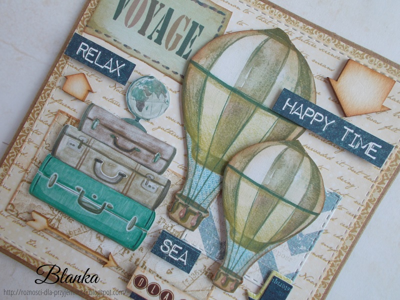 Kartka zainspirowana paletą z wyzwania z gościem w Rapakivi - głównie walizkami i strzałkami, ale też tłem z tekstem. Walizki i balony wycięłam z zestawu Discover Cards od Janet.